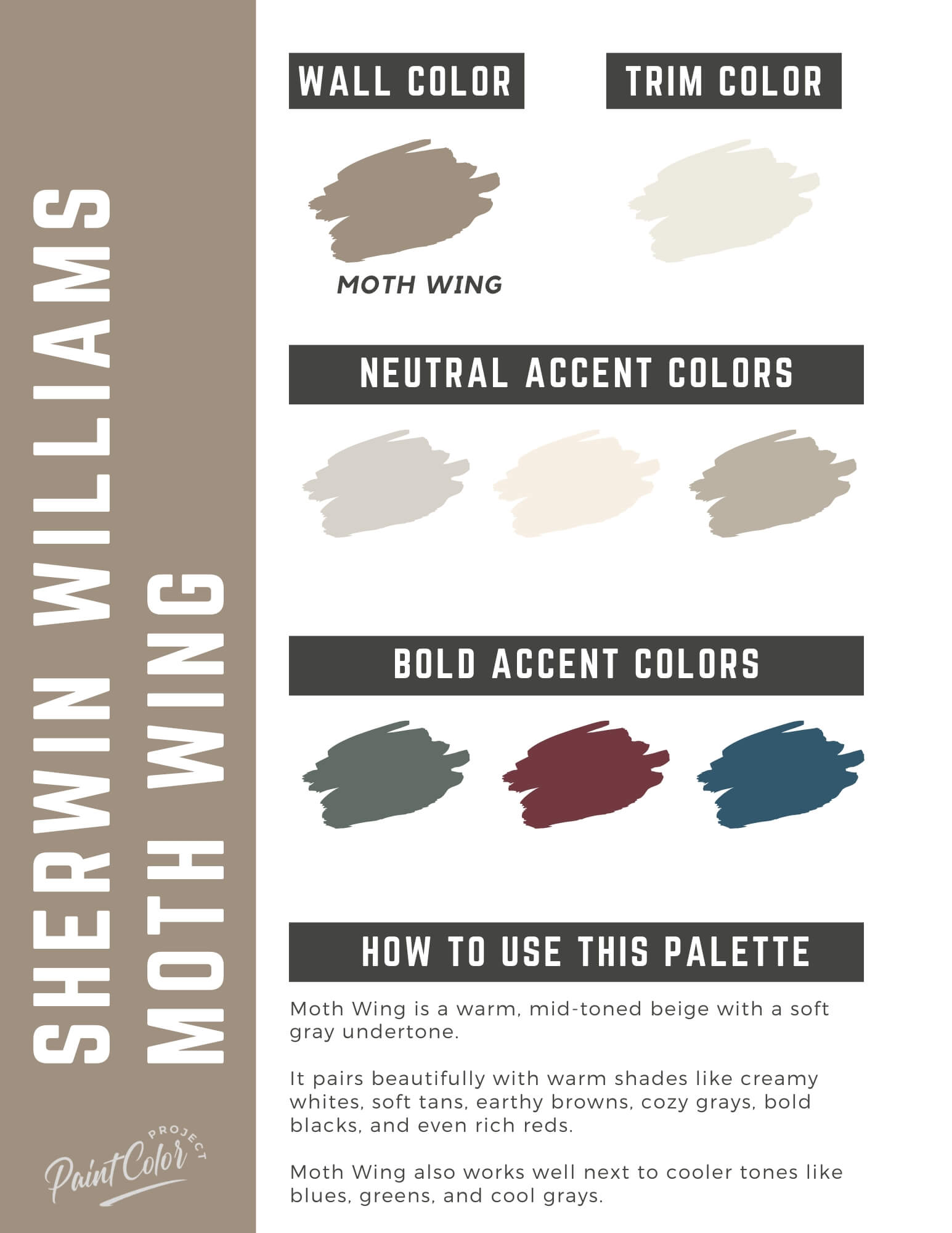 This is a collection of beautiful paint colors is based around Sherwin Williams Moth Wing as a wall color.